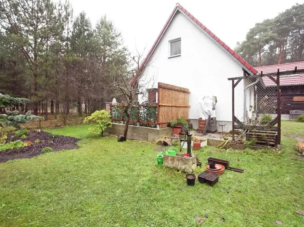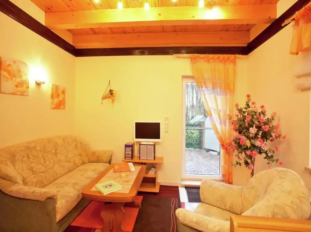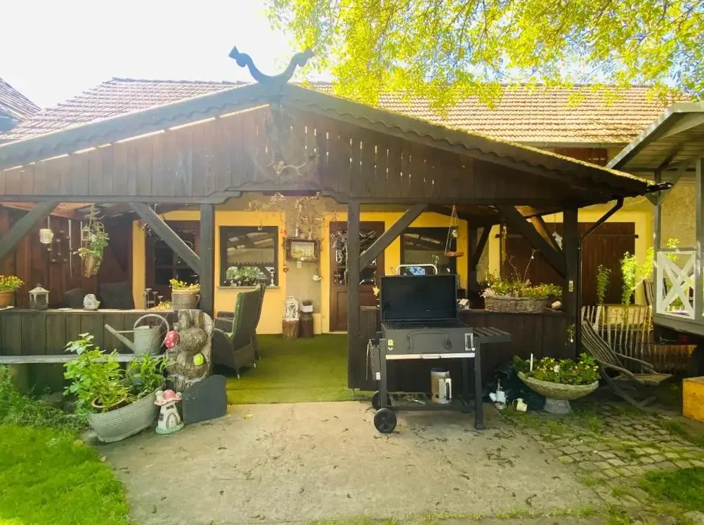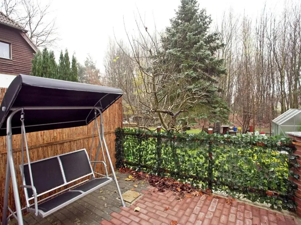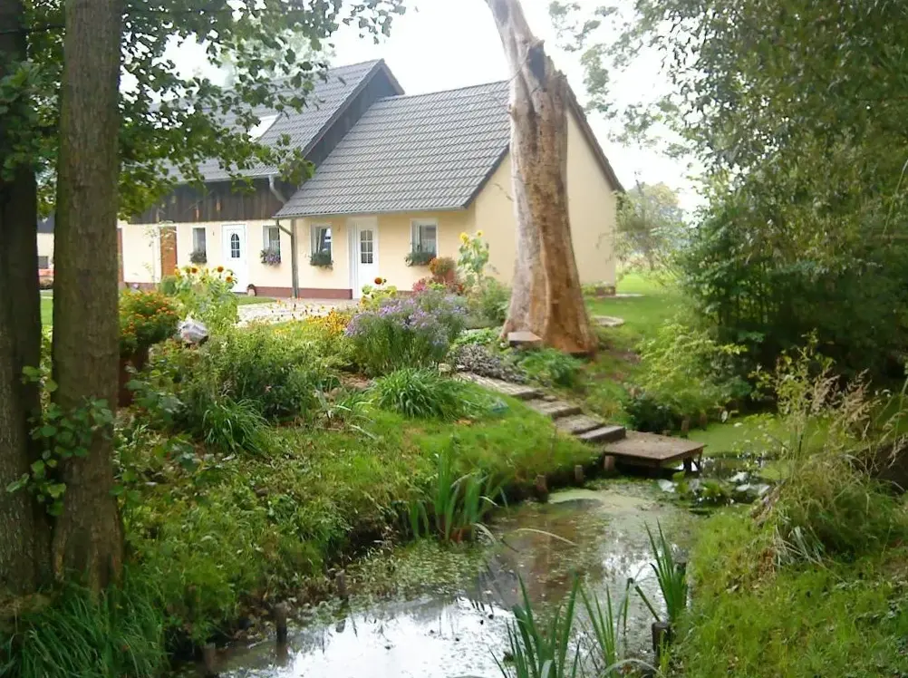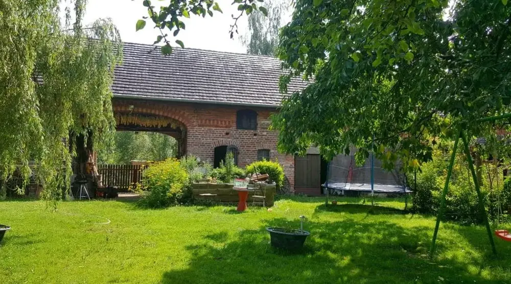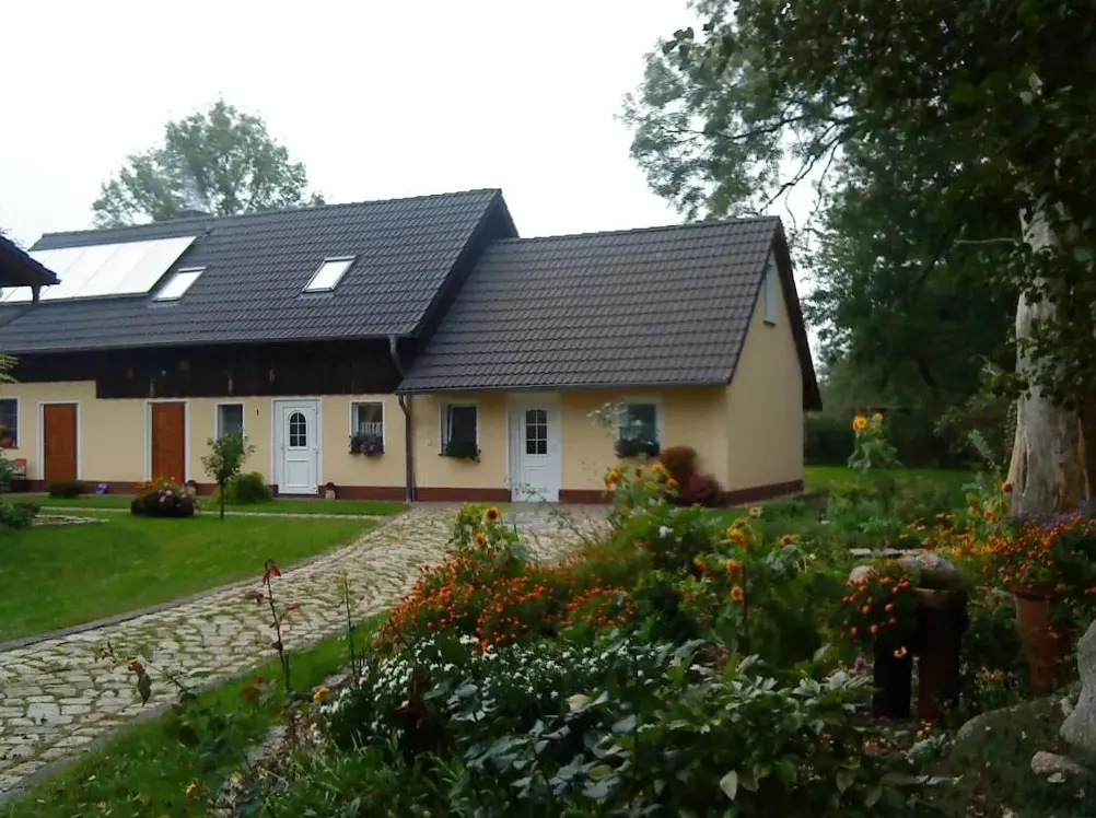 More information about Pension zum Reiterhof, DoppelbettzimmerFerienhaus in Brandenburg is a holiday home located in Schmogrow, Germany, offering comfortable accommodations with two bedrooms, a living room, and a bathroom. The property provides a fully equipped kitchen, dining area, and cozy seating space for guests. Outdoor spaces include a garden and terrace with scenic garden views, along with barbecue facilities and outdoor furniture.