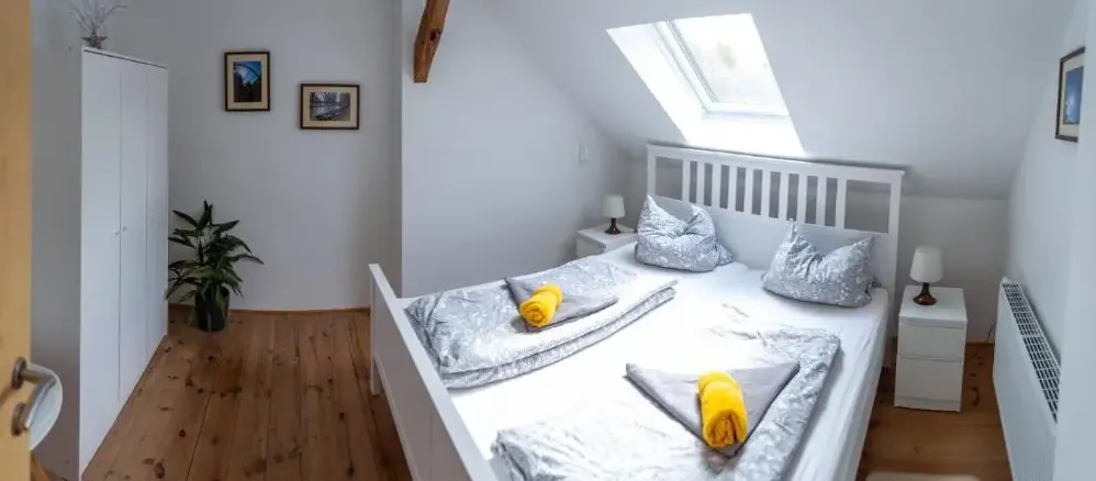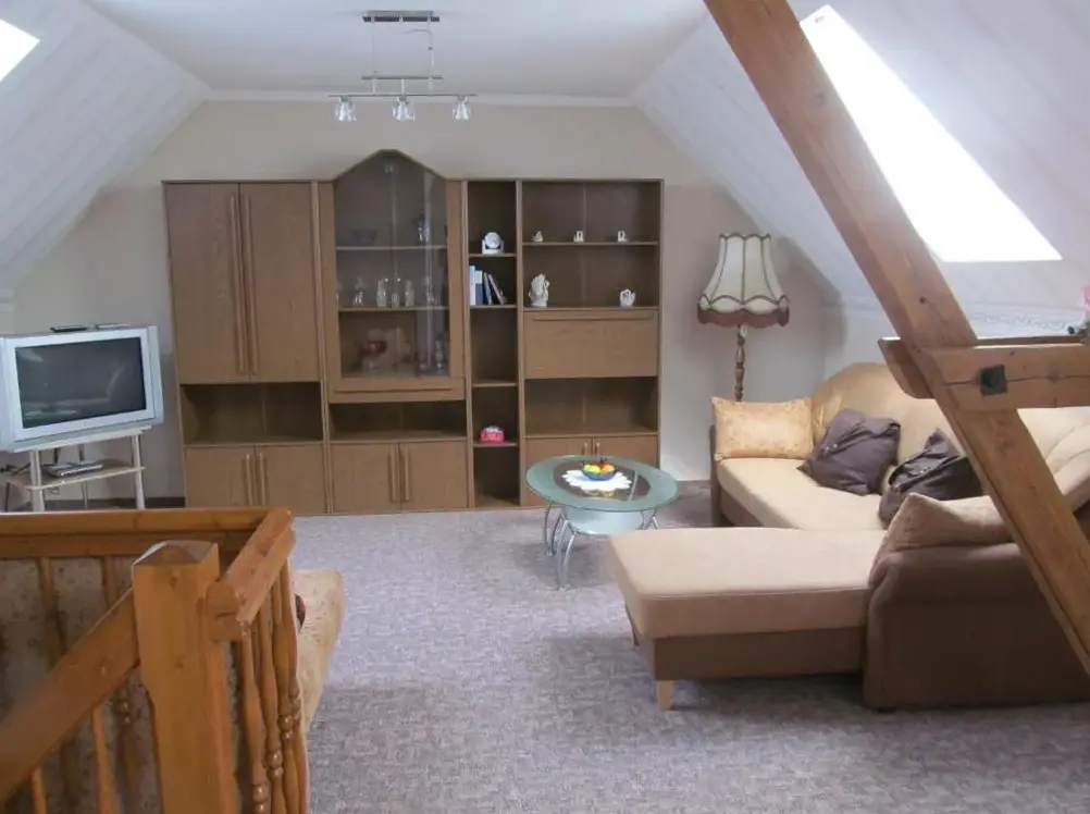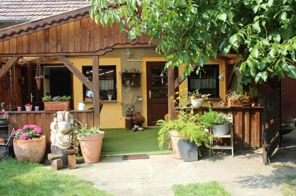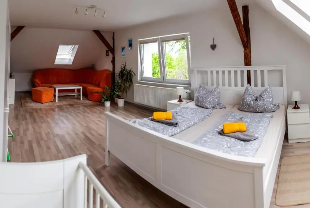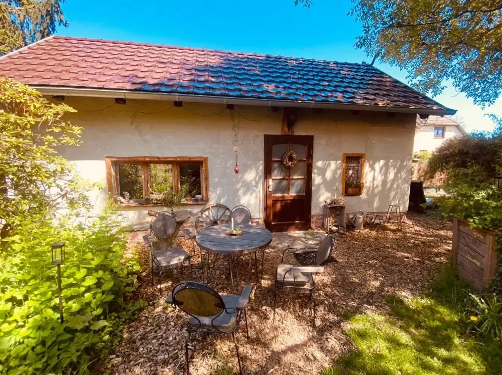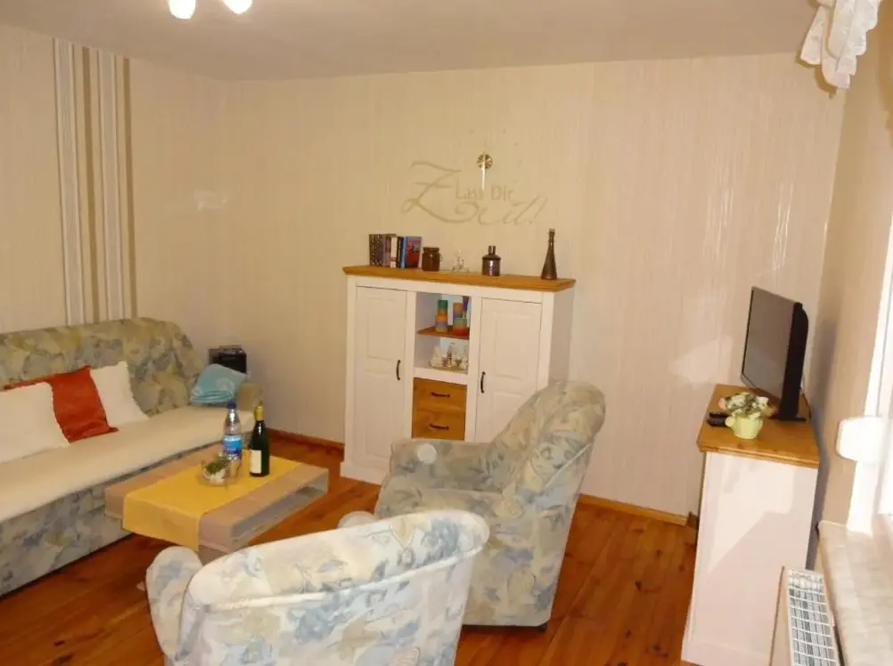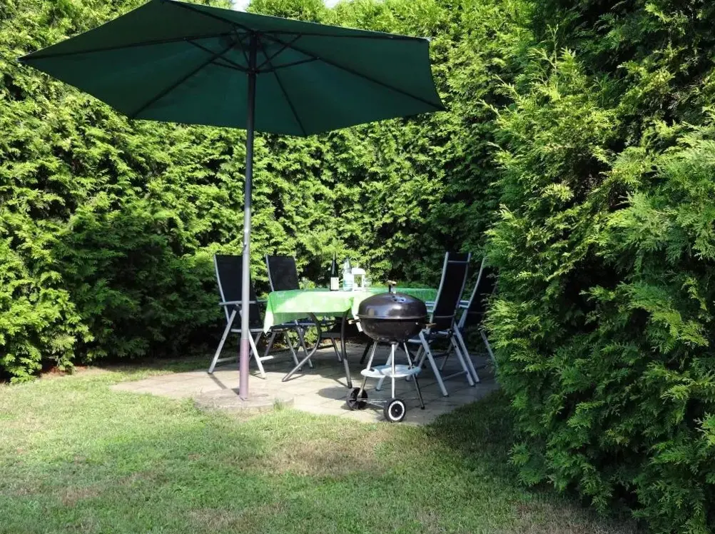 More information about Pension zum Reiterhof, DoppelbettzimmerFerienhaus in Brandenburg is a holiday home located in Schmogrow, Germany, offering comfortable accommodations with two bedrooms, a living room, and a bathroom. The property provides a fully equipped kitchen, dining area, and cozy seating space for guests. Outdoor spaces include a garden and terrace with scenic garden views, along with barbecue facilities and outdoor furniture.